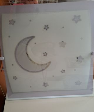 Lámpara de techo lila suave. Las estrellas y luna brillan un rato cuando se apaga la luz. Medidas 39x39