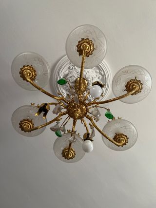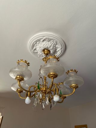 Lampara comedor cristal y dorada. Algunos cristales están rotos.