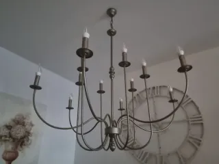 Elegante lámpara de araña con un diseño clásico y detalles de lágrimas de cristal. - Estructura principal de metal plateado. - Colgantes de cristal transparente en forma de lágrima. - Múltiples brazos con portalámparas. - Adornos de cristal en cascada.