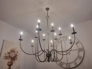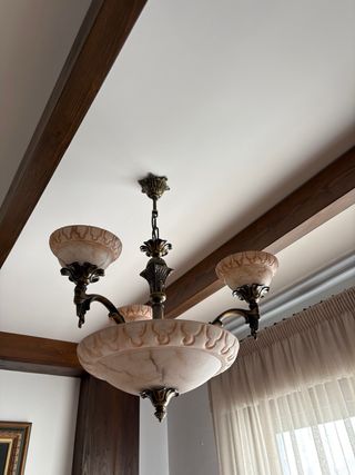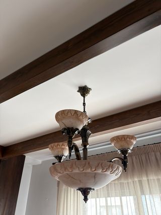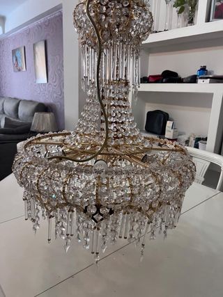 Elegante lámpara de araña de estilo antiguo, con un diseño intrincado que aporta un toque de sofisticación. - Estructura de metal con detalles ornamentales. - Colgantes de cristal que refractan la luz. - Acabado en tonos dorados y transparentes.