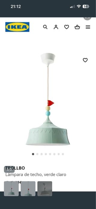 Lámpara de techo infantil TROLLBO de IKEA, con un diseño inspirado en el circo. Es de color verde claro y tiene detalles multicolores. - Diseño divertido y colorido. - Material de plástico.