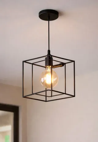Lámpara colgante con un diseño moderno y elegante. Su estructura geométrica le da un toque industrial. - Acabado en negro. - Bombilla transparente de cristal. -La bombilla incluida en el precio