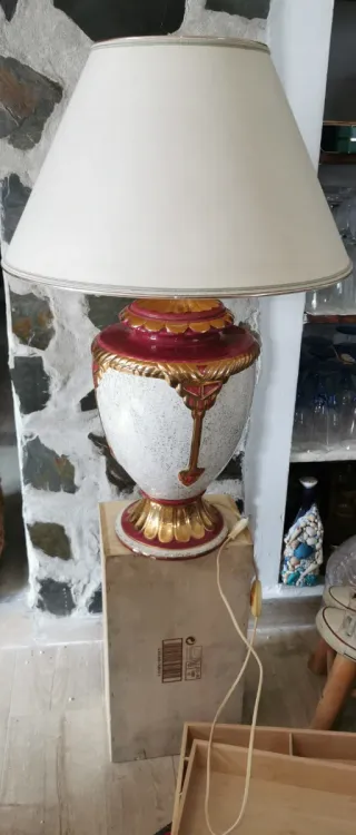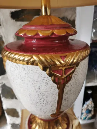 Elegante lámpara de mesa con un diseño vintage de la marca Bondia 50 aniversario. Su base de cerámica y detalles metálicos le dan un toque sofisticado. Presenta una pequeña tara en la parte inferior que no es visible. La medida de solo la lámpara sin la pantalla es de aproximadamente 50 cm. - Acabado en blanco moteado y detalles dorados. - Adornos en color burdeos en la parte superior.