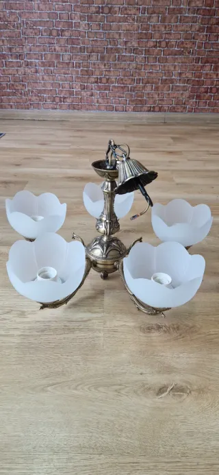 Elegante lámpara de techo con un diseño clásico y acabados en dorado. Sus tulipas de cristal blanco aportan un toque de luz suave. - Estructura principal de metal. - Cinco tulipas de cristal esmerilado con forma de flor. - Detalles ornamentales en la base y el tallo.