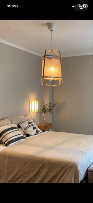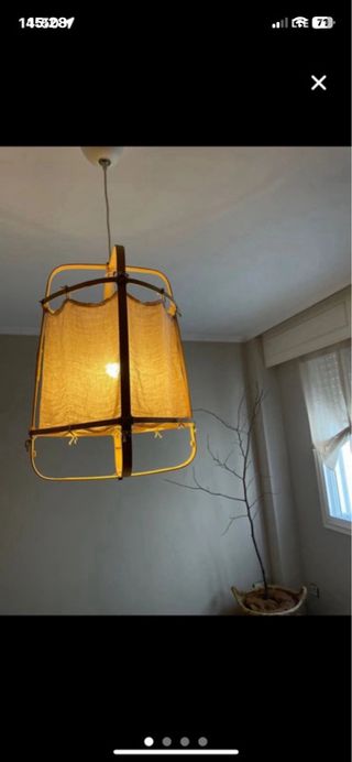 Pack que incluye una lámpara de techo y dos lámparas de mesilla a juego. Dimensiones lámpara de techo 70cm diámetro y 70cm de alto. Dimensiones lámparas mesilla 18cm diámetro y 34cm de alto. En perfecto estado. Recogida por parte del comprador.