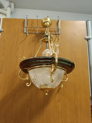 Elegante lámpara de techo con detalles en dorado y verde. Su diseño combina materiales de calidad para un toque distintivo. - Estructura principal de metal. - Elementos decorativos de cristal. Falta solo una tulipa las otras 2 estan en perfecto estado