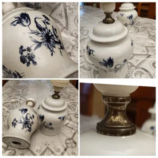 Conjunto de dos lámparas de mesilla con un diseño floral en azul sobre fondo blanco. Tienen 40 años!! - Base de porcelana con detalles pintados. - Acabado metálico en la unión del pie (con desgaste)