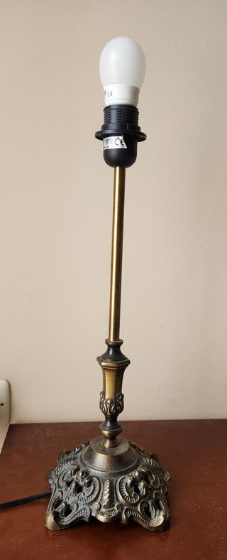 Pie de lámpara antiguo de bronce macizo, de gran calidad. Altura 45 cm. Decoración clásica con base ornamentada. Funciona correctamente. Se vende sin pantalla. Ideal para decoración vintage o clásica.