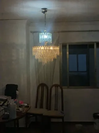 SE VENDE PACK DE LÁMPARAS + 1 APLIQUE A JUEGO. Hay 3 tamaños. Pregunten sin compromiso. SOBRE EL PRECIO. 10€ el aplique 35€ las grandes (5 bombillas) 20€ las pequeñas (3 bombillas) Elegante lámpara de araña con un diseño clásico y detalles de cristal. - Acabado plateado. - Cristales transparentes colgantes. - Estructura de metal.