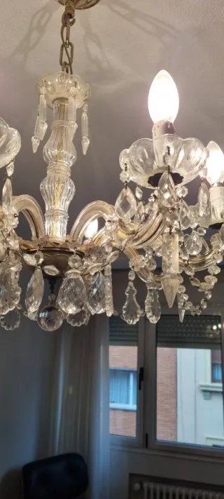 Elegante lámpara de araña con detalles en cristal de Roca y metal. - Diseño clásico y sofisticado. - Aporta un toque de luz y distinción a cualquier estancia. - Ideal para salones o comedores.