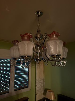 Elegante lámpara de techo con un diseño clásico y detalles en cristal y metal. Sus tulipas de cristal emiten una luz cálida y acogedora. - Diseño con múltiples brazos. - Acabado en plata pulida. - Tulipás de cristal esmerilado con borde rosa. (No se incluye carga/decarga y transporte del producto(s))