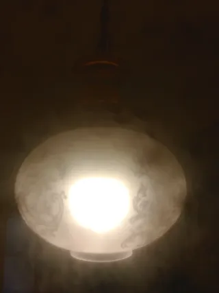 Elegante lámpara de techo con un diseño único. - Piezas de cristal en forma de lágrima. - Detalles en tonos miel y transparentes. - Estructura superior con adornos de cristal. Tiene mucho polvo, por eso no brillan los cristales
