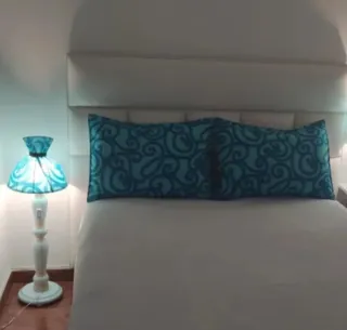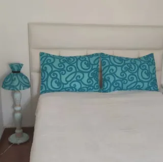 Lámpara y cojines en tonos azules. Los cojines miden 70x50cm. La lámpara de pié es de madera maciza con detalles de cuerda y mide 90cm de alto y 30cm ancho de pantalla. Entrego en Gijón y hago envíos.