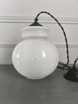 🌿Lámpara de techo antigua de estilo Art Deco. Cableado en cordón negro y florones en metal negro. 🌿- Pantalla de cristal opalina.