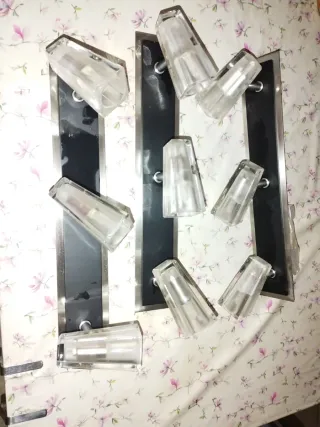 Conjunto de lámparas de diseño moderno, versátiles para pared o techo. Su acabado combina elegancia y funcionalidad. - Estructura principal en color negro. - Difusores transparentes de cristal y plástico. - Base metálica para una fijación segura. Las 3 por 5 euros