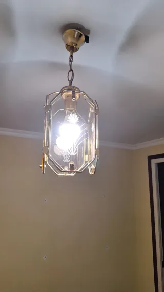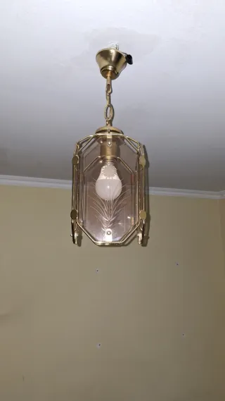Elegante lámpara de techo colgante con un diseño octogonal. - Estructura metálica en tono dorado. - Paneles de cristal con grabado decorativo. - Bombilla de casquillo E27 (no incluida).