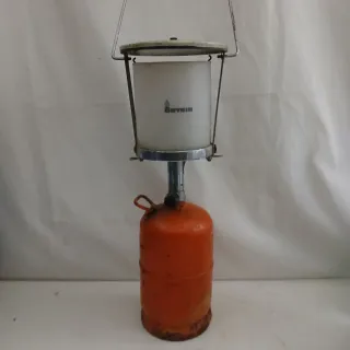 Lámpara de gas para camping con un diseño práctico y funcional. - Cuerpo principal en color azul. - Cúpula translúcida para una luz suave. - Asa metálica para colgarla fácilmente.