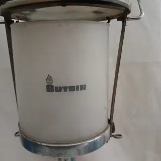Lámpara de camping Butsir con un diseño clásico y funcional. - Cilindro de vidrio esmerilado. - Base y estructura de metal. - Asa para colgar.