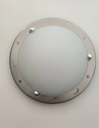 Lámpara de techo con un diseño moderno y elegante. - Base metálica en color plata. - Difusor de plástico blanco. - Detalles decorativos de estrellas y lunas.