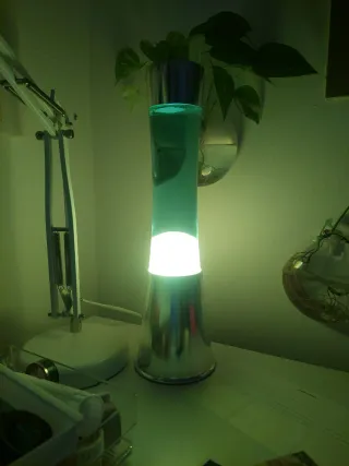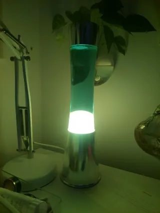 Lámpara de lava con un diseño moderno y llamativo. - Base y tapa de metal plateado. - Cilindro de cristal con líquido turquesa.
