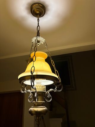 Elegante lámpara de techo con un diseño clásico que recuerda a un quinqué. Su acabado metálico le da un toque sofisticado. - Combina detalles dorados y amarillos. - Fabricada con metal y cristal.