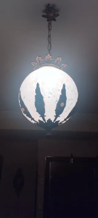 Elegante lámpara colgante con esfera de cristal y detalles ornamentales dorados. - Diseño con motivos vegetales. - Base y cadena metálicas.