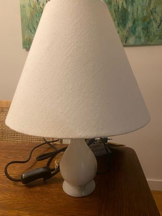 Lámpara de mesa de diseño moderno, ideal para mesita de noche o escritorio. - Base y pantalla de plástico. - Color blanco. - Hay que comprar la bombilla (vale 1€)