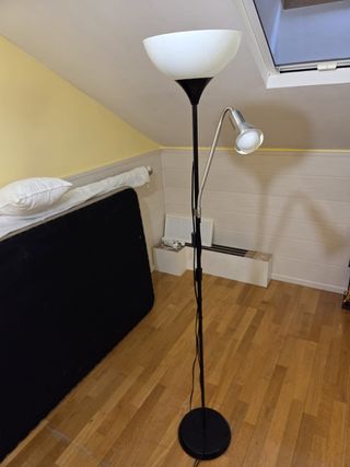 Lámpara de pie con un diseño moderno y funcional. - Altura ajustable. - Doble luz: una principal y un foco direccional. - Base redonda estable.