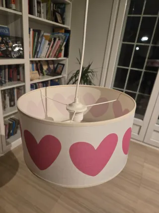 Bonita lámpara colgante de Ikea con un alegre diseño de corazones. - Estructura de tela. - Motivos de corazones en color rosa sobre fondo blanco. Se regalan dos focos empotrables y estructura de lámpara de techo.