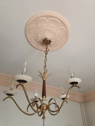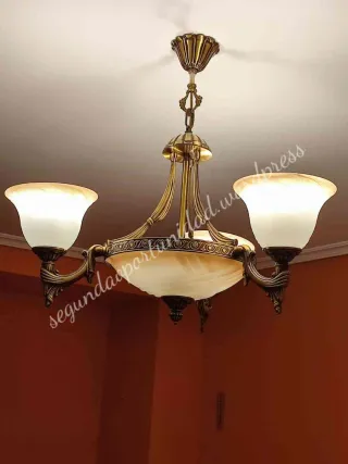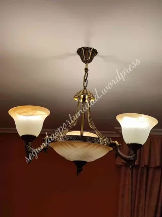 Elegante lámpara de techo antigua con un diseño clásico. Incluyo bombillas. - Estructura principal en metal dorado. - Tulipas de cristal con detalles decorativos. - Diseño de cinco brazos.