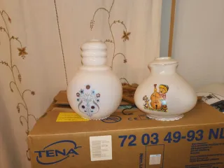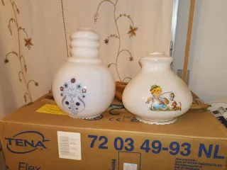 Dos tulipas de cristal para lámpara, con un diseño floral y un dibujo de un niño pescando. - Tulipa con diseño floral en tonos azules y marrones. - Tulipa con dibujo de un niño pescando y un perro. - Base con borde decorativo.