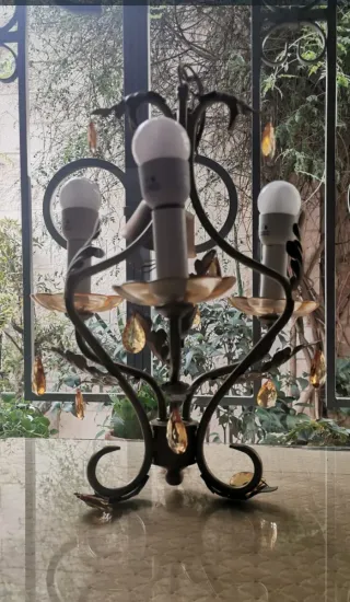 Elegante lámpara de mesa con un diseño de forja y detalles en dorado. Sus cristales colgantes añaden un toque de brillo. - Estructura de metal con acabado en negro. - Cristales en forma de lágrima de color ámbar. - Tres puntos de luz.