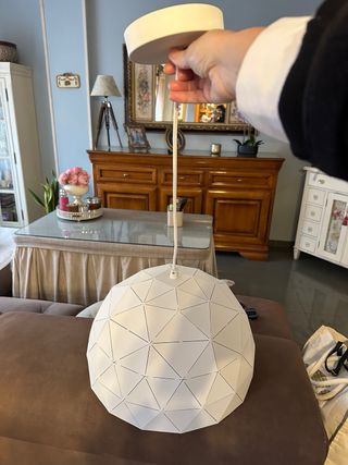 Lámpara colgante con un diseño geométrico moderno. Su forma esférica está compuesta por múltiples facetas triangulares. - Estructura de papel y plástico. - Color blanco.