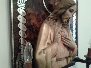 Necesita recableado,,,67 cms alto 50cms ancho... Preciosa lámpara de pared con figura del Sagrado Corazón de Jesús. Es una pieza única, Figura del Sagrado Corazón de Jesús, ideal para colgar en la pared. Incluye luz. - Diseño detallado. - Apto para colgar.