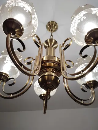 Ubicación Arnedo Elegante lámpara de salón con un diseño clásico y sofisticado. Sus cinco tulipas aportan una iluminación cálida y acogedora. - Estructura principal en metal dorado. - Tulipas de cristal con detalles en tonos beige y marrón. - En la tulipa inferior hay 3 huecos para bombillas - Permite encendido por fases, o tulipas o parte inferior En total se pueden encender 8 bombillas