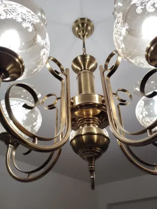Se vende lámpara de techo dorada con cinco brazos. Un brazo está quitado como se aprecia en la última foto. Se puede poner fácilmente a rosca. Bombillas NO INCLUIDAS. Se incluyen tacos y tornillos de montaje. Se envía desmontada.