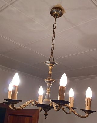 Elegante lampara antigua de seis brazos. Ideal para dar un toque clásico a tu hogar. - Estructura en metal y cristal. - Diseño de estilo vintage. - En color negro y dorado. Las medidas del producto no son correctas, no las tengo,las he puesto para guardar el producto.