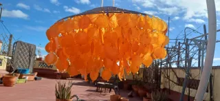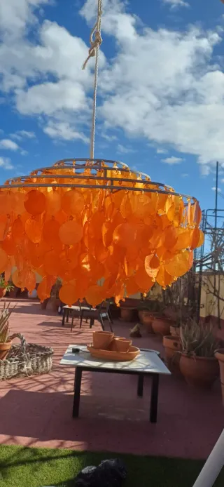 Lámpara colgante decorativa con un diseño único. Tulipa 60 cnt diametro estructura metalica, 5 cnt dicos nacar. - Estructura superior metálica. - Colgantes en forma de hoja de color naranja. - Ideal para dar un toque de color.