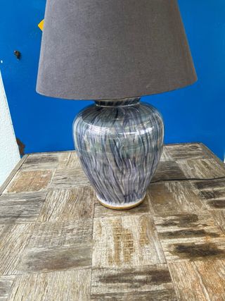 Bonita lámpara de sobremesa con base de cerámica y pantalla de tela. - Base con diseño abstracto en tonos azules y grises. - Pantalla de tela gris.