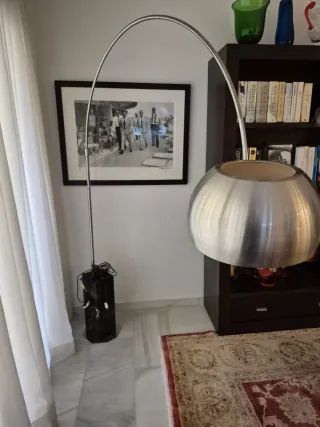 Elegante lámpara de pie con un diseño curvo y moderno. Su acabado metálico le da un toque sofisticado a cualquier espacio. La base es extremadamente pesada, probablemente unos 30 kg. - Estructura de metal plateado. - Pantalla redonda de metal.