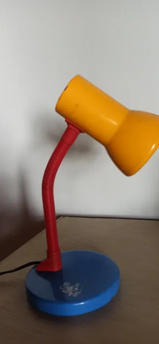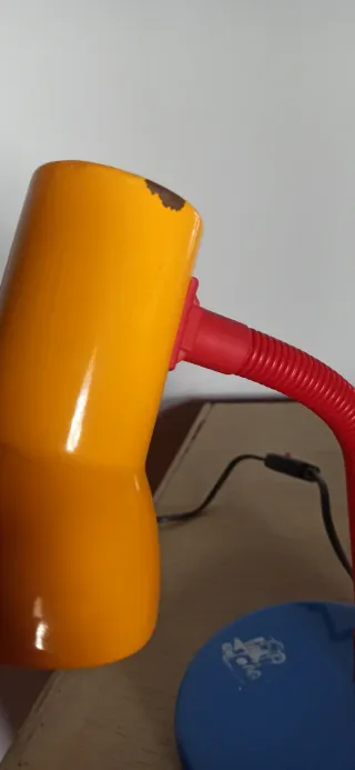 Lámpara de escritorio con un diseño retro de los años 80. Perfecta para añadir un toque nostálgico a tu espacio. Desgaste típico por el uso - Base redonda. - Brazo flexible para ajustar la luz. - Pantalla cónica.