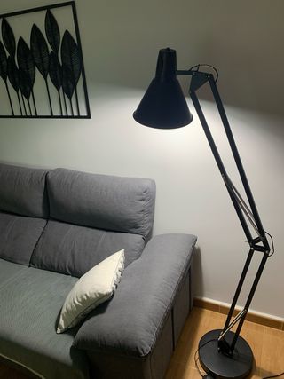 Lámpara de pie con un diseño tipo flexo, ideal para salones o estudios. Su estructura permite ajustar la luz fácilmente. - Acabado en color negro. - Base redonda y estable.