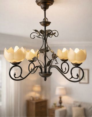 Elegante lámpara de techo de estilo vintage, con forma de tulipanes y hojas de vid. Sus tulipas de cristal en tono beige y su estructura de hierro de forja le dan un toque distintivo. Negociable. - Diseño floral en las tulipas. - Brazos curvos con detalles decorativos.