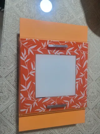 Lámpara con un diseño floral en tonos naranja y blanco. Ideal para añadir un toque de color a cualquier espacio. - Marco con estampado de hojas blancas sobre fondo naranja. - Panel central blanco.