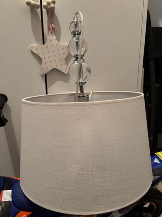 Elegante lámpara de techo con un diseño moderno. - Pantalla de tela en color blanco. - Base y detalles decorativos en metal plateado. - Elementos esféricos de cristal en el pie de la lámpara.