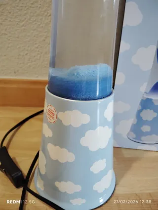 Lámpara de lava con un diseño divertido de nubes. - Base y cilindro de plástico. - Tonos azules y blancos.