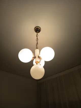 Lámpara de salón con tulipas de cristal opaco. Como puede comprarse en la foto, tiene una tulipa rota en uno de sus pétalos. Conservo el trozo roto.
