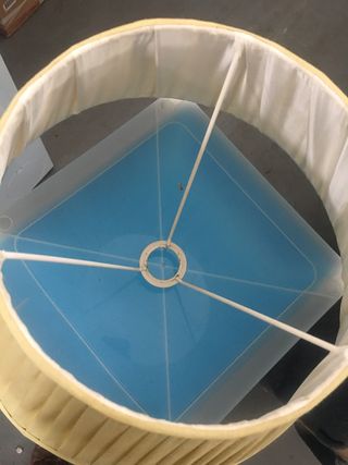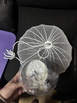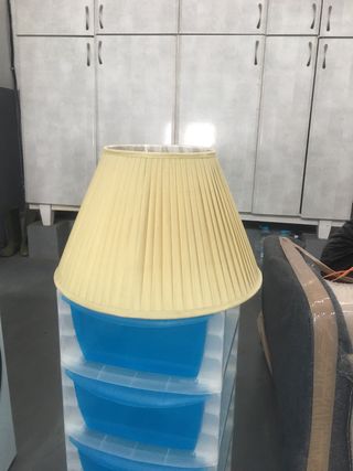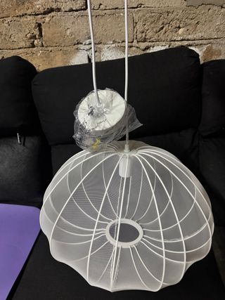 Lampara de Ikea , es de metal, y plástico. Con unas lengüetas que tú las doblas hacia dentro para dar más luz o menos, al ser metal, en la doblez de las lengüita se le ha quitado la pintura como se ve en la foto, es poca cosa, pero por eso el precio. No lleva bombilla. Mide 30 de alto.