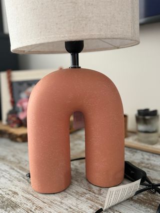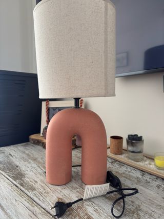 Lámpara de mesa con un diseño moderno y original en forma de arco. Su base de terracota le da un toque rústico y elegante. - Base en forma de arco. - Pantalla de tela. - Materiales: terracota y tela.