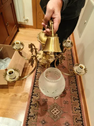 La lámpara es muy bonita y de diseño moderno y original. Está en perfecto estado. Se puede poner o ajustar a la altura que se necesite,mediante las roscas de unos tubos de sujeción.